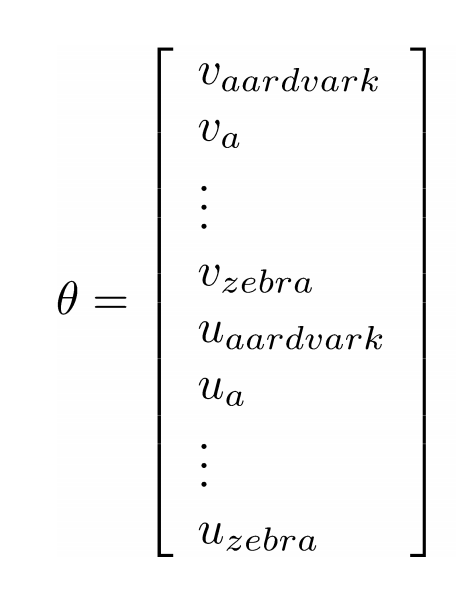 모든 단어들이 각각 중심 단어일 때와 주변 단어일 때로 나눠서 theta 벡터를 나타냄