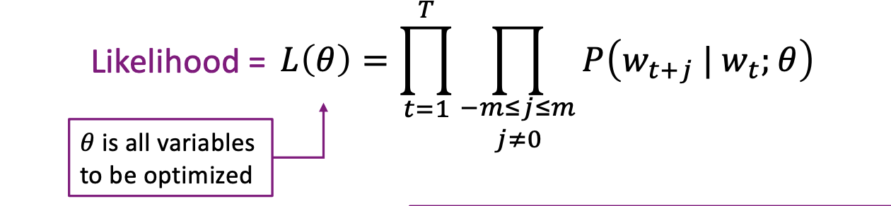 theta: 모든 모델 parameters를 하나의 벡터로 나타낸다. (d dimension, v개의 words)