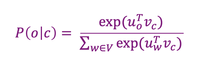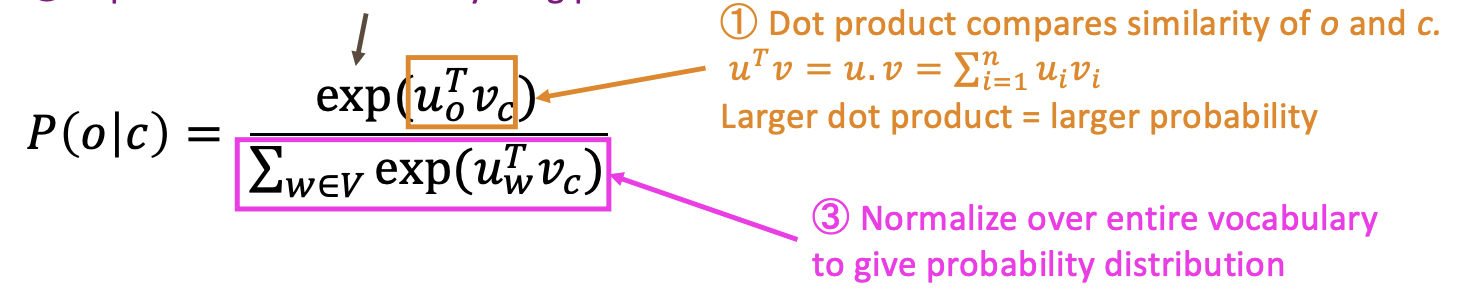 • Use the similarity of the word vectors for c and o to calculate the probability of o given c (or vice versa)